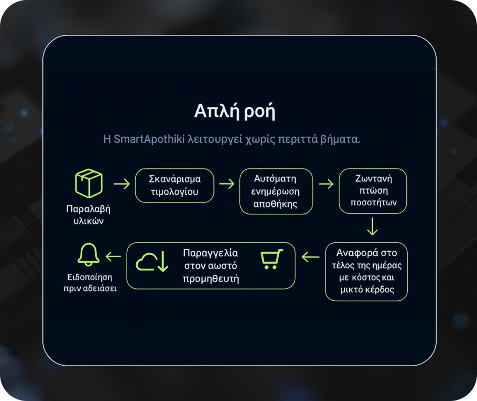 Μειώνει τις διπλές εργασίες, προλαβαίνει τις ελλείψεις και δείχνει καθαρά το πραγματικό κόστος.