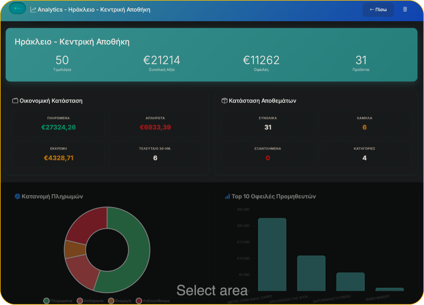 Είναι πλατφόρμα για αποθήκη εστίασης. Συνδέεται με POS, σαρώνει τιμολόγια με OCR και δείχνει καθαρά κόστος, κατανάλωση και αποθέματα σε πραγματικό χρόνο.